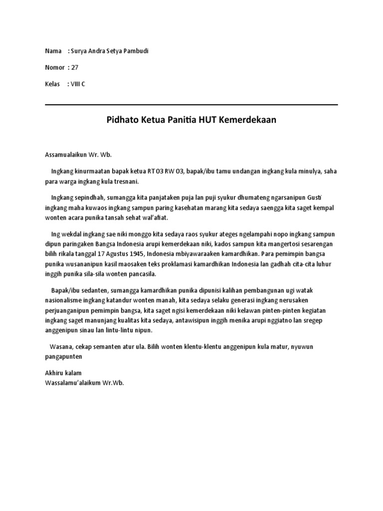 Pidato bahasa jawa yang bertema kemerdekaan sangat diperlukan untuk menyambut hari istimewa bangsa indonesia. Adanya contoh pidato dapat kalian pergunakan sebagaimana mestinya sebagai inspirasi karya kalian sendiri. Kegiatan lomba yang diselenggarakan mulai dari jam 8.30 terasa biasa yaitu lomba anak anak dan ibu ibu. Posted on august 17 2016 august 18 2016 by kompleklinuxasri. Pidato hari kemerdekaan untuk anak siswa good morning everyone presents here, i____from class____studying in (school name), i am here to give a speech on independence day. Selamat pagi semua, kepada yang terhormat bapak dan ibu sekalian. Berikut adalah kumpulan berbagai tema contoh teks pidato bahasa indonesia yang menarik untuk semua kalangan. We all are here for this special occasion. Pidato kemerdekaan untuk anak sekolah dasar (sd) 11:29, 2/3/2020 faisalsyahrulanamm: Dalam sejarah, kita belajar bahwa perjuangan merebut kemerdekaan dari para penjajah, bukan sesuatu yang sepele. Nah sseperti yang tertera pada judul diatas, maka pada artikel ini saya akan berbagi contoh teks pidato yang cocok untuk porsi anak sd. Contoh pidato kemerdekaan untuk anak sd; Sampai adzan dhuhur acara masih biasa, namun tepat jam 14.30 acara menjadi hangat dan menarik karena ada perlombaan panjat pohon pisang.